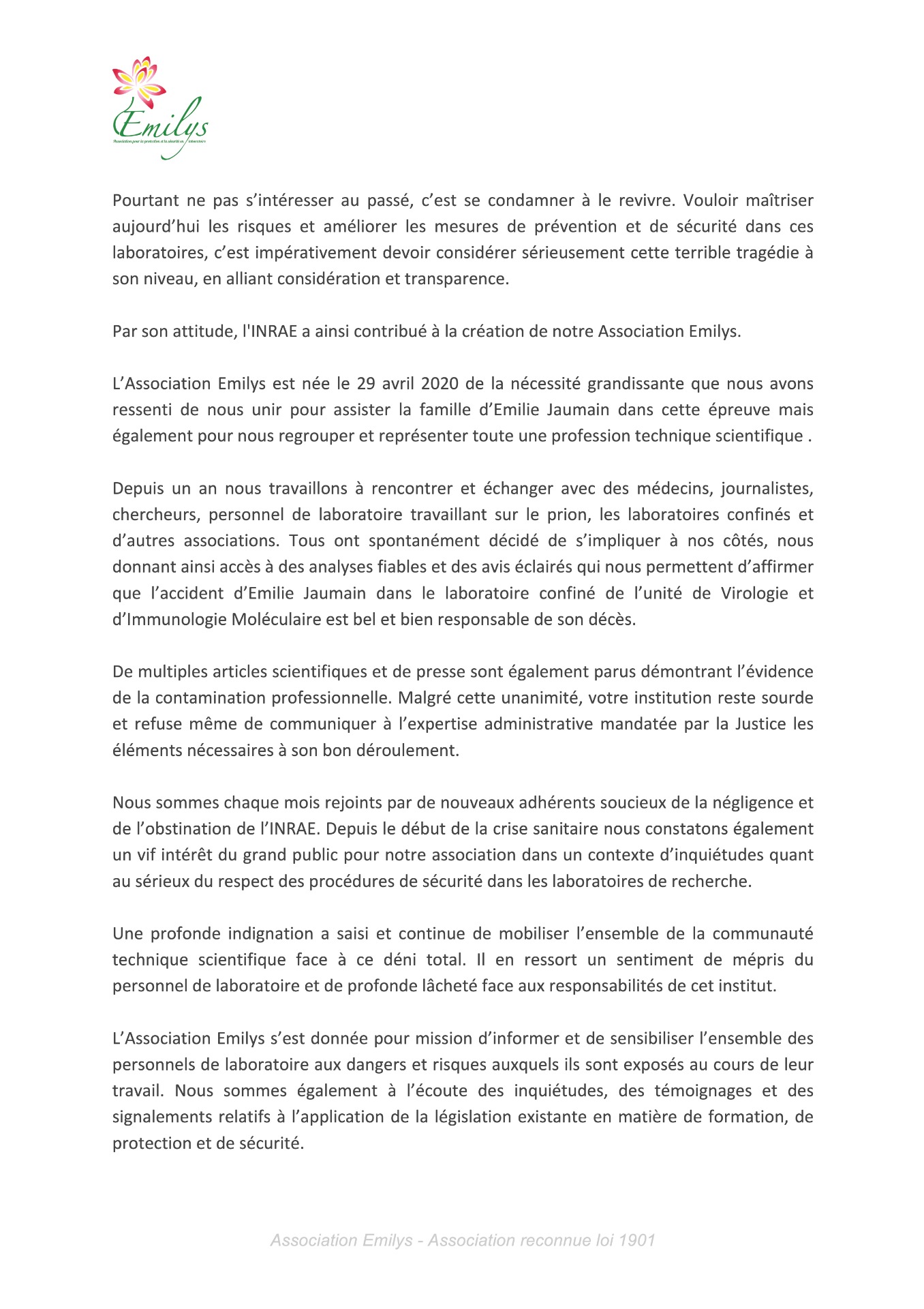 Parallèlement à l'action de sensibilisation du 17/06/2021, l'Association Emilys a interpellé ouvertement le président de l'INRAe par courrier afin de lui demander de sortir son institut de cette situation de blocage et lui faire reconnaître publiquement sa responsabilité dans le décès d'Emilie.